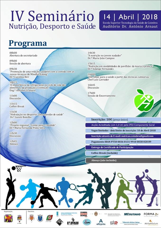 A Associação de Basquetebol de Coimbra em parceria com a Escola Superior de Tecnologias da Saúde de Coimbra e a Associação de Futebol de Coimbra organiza no próximo dia 14 de abril de 2018 o IV Seminário de Nutrição, Desporto e Saúde.